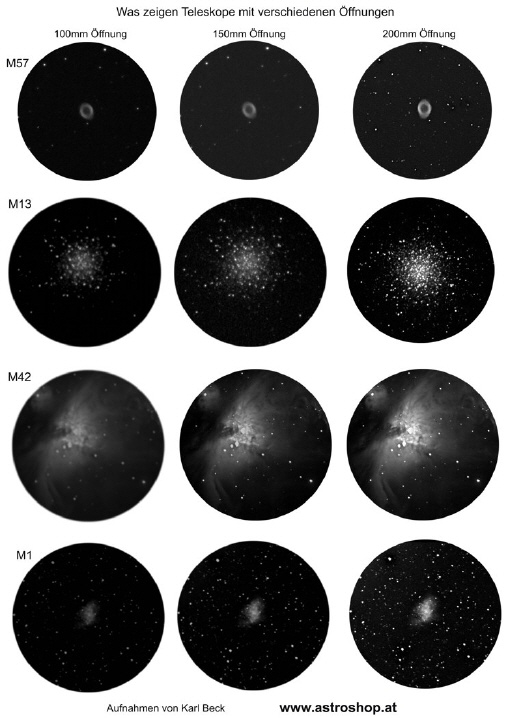 Beim Mond und den Planeten werden weitere Details sichtbar, der größte Gewinn aber ist bei Deep Sky Objekten zu verzeichnen. Gasnebel zeigen feine Strukturen, Sternhaufen werden bis ins Zentrum aufgelöst und sind noch in einer Entfernung von 20.000 Lichtjahren sichtbar. Auch viele der hellen Kugelsternhaufen erscheinen als glitzernde Kugeln aus Sternenstaub. Galaxien können bis in eine Entfernung von 500 Millionen Lichtjahren beobachtet werden, auch die hellsten zeigen viele interessante Dinge: helle Zentren, Spiralarme und Dunkelwollken werden sichtbar. Unter einem guten Himmel ist es zum Beispiel keine Schwierigkeit Details der Whirpool galaxien auszumachen, auch der Ringnebel in der Leier wird schön abgebildet.